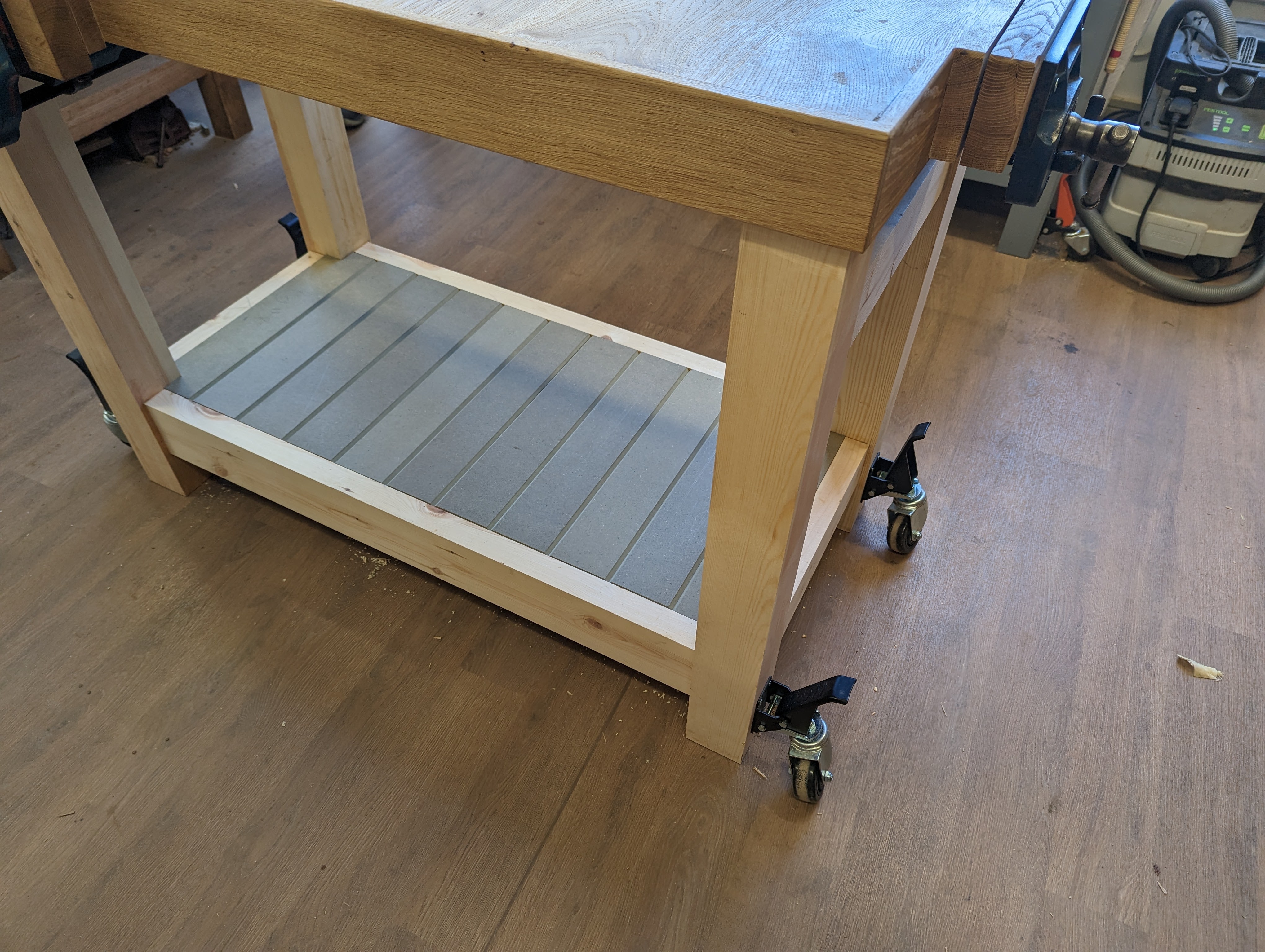 They are typically 1200mm x 600mm which suits the more “normal” UK garage or shed and are fitted with raisable castors for easy moving combined with totally stable placement. The legs are made of 100mm square pine and the top is 75mm of very solid moisture resistant mdf laminated and surrounded with European oak. The height depends on the individual but is usually in the 850-950mm range. We add a removable lower shelf which is very strong and can be used as is or makes a sturdy platform for tool drawers.