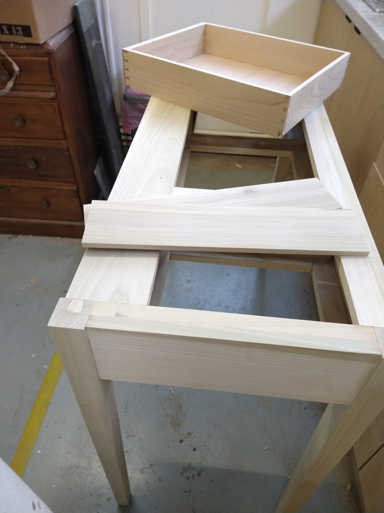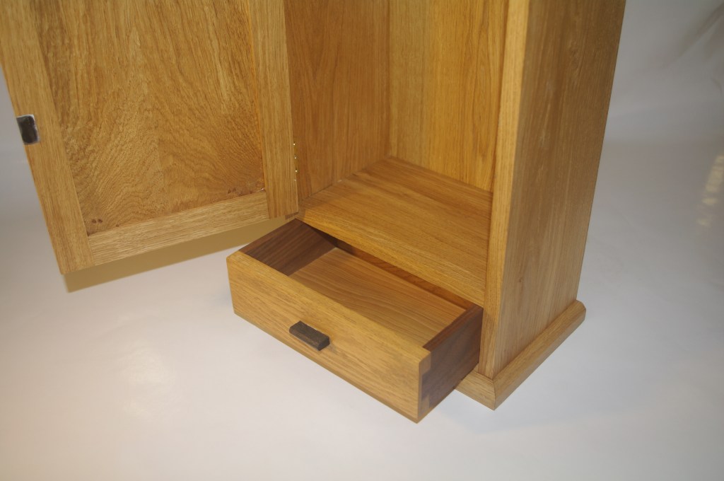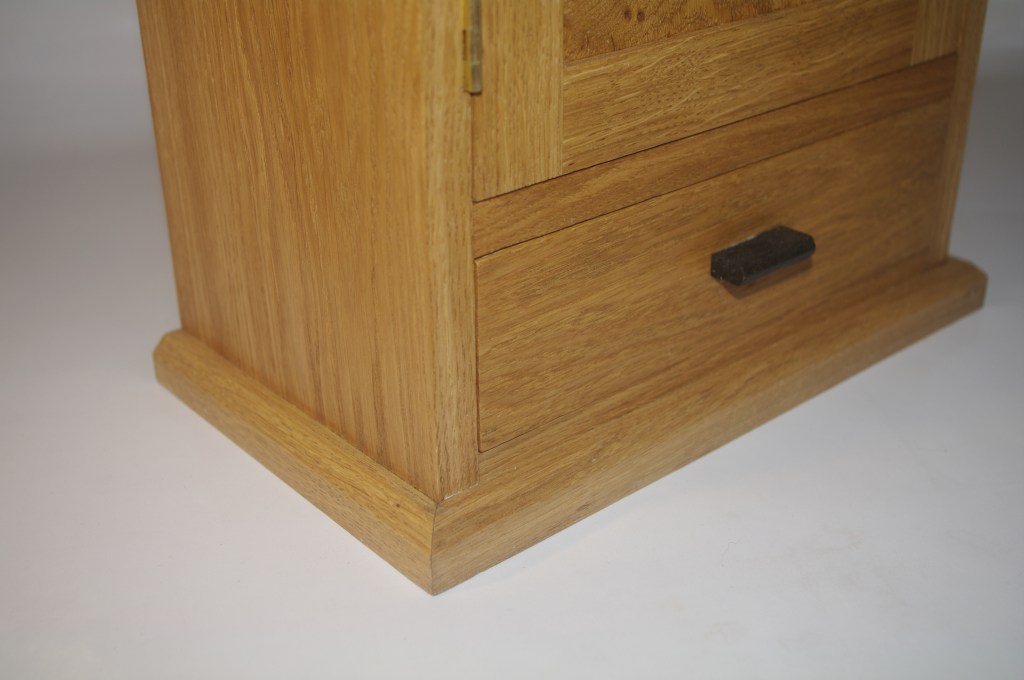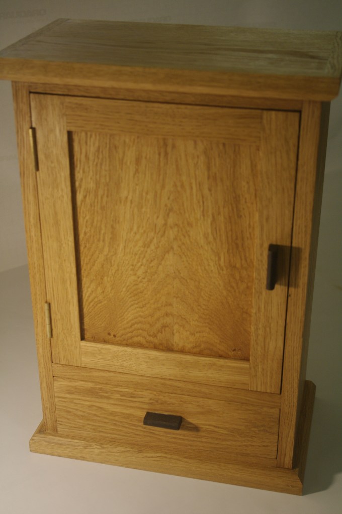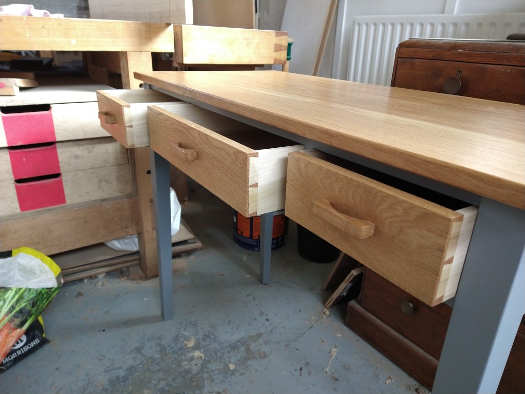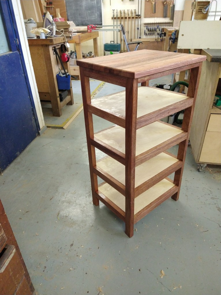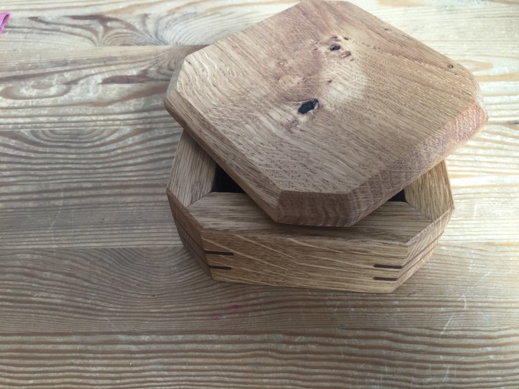 A rather strange project. We bought a magnetic knife rack – when unboxed it was incredibly plasticky and tacky – which should not have been a surprise since it cost £2.99 So the task was to break it apart and use the magnets and metal bars as a base from which to make something a little more pleasing to the eye. This was pulled together using a small piece of burr walnut as a support for the “bars” and an offcut of indian rosewood for the surround – all backed with maple. Slightly over the top maybe for a £2.99 knife rack – did we say how bored we are?This was a quick project to create a simple box to store seed packets. The wood came from an old shelf unit – we are not really sure what wood it is – it’s a very light wood with a fairly dense grain – it looks a lot more solid than it is. The top was laser engraved to personalise it. The brass hinges should ideally be complemented with a brass catch but we can’t get our hands on one at the moment so a rather rough looking chrome catch will have to do for now. The box is finished in 2 coats of boiled linseed oil and 2 coats of wax.This small cabinet was one of the prototypes for the “second project” project. After completing the introductory box building course, many people are keen to continue but don’t want to jump straight to a fairly large piece of furniture. We designed this simple one drawer, one door cabinet as a natural step up from the box building course. This version is in oak with bog oak handles – but it can also be made in ash with walnut handles. Also, not everyone has room for a new piece of furniture; the door can be fitted with a blackboard or a mirror to make it useful around the house.Very much work in progress here…. A “proptotype” desk for homeworking. One of the things we have found in our house is that we don’t have the space in the bedrooms for a full sized desk so we have been using all sorts of awkward surfaces to work on. So we decided to build a small desk with drawers that could maybe double as a dressing table or side table post-lockdown. This desk is only a little over 1m long and pretty narrow but easily big enough for a laptop and work papers. This is made primarily from Tulip wood /Poplar as it is pretty cheap with just the drawer fronts in Oak. The Poplar has a very variable colour pattern ranging from quite nice light colours to a dirty murky green – so all of the exposed Poplar will be painted. (lots of smart painted kitchens have Poplar framework) We are not sure what colour yet – it needs to match the finished oak – however the undercoat primer itself is currently a strong favourite. We are still planning the Wharfedale Workshop week long summer school project – and a desk like this may well feature. Watch this spaceWell, here is the finished prototype. We added some simple handles out of an oak off-cut – we think they do seem to match the general style of the desk. In the end we did decide that the Rustins Primer/Undercoat shade was rather nice and we had some Dulux Eggshell mixed in the identical colour by the excellent people at Mortons. The oak was then given three coats of OSMO satin wax oil. . So – the final conclusion; in general we are quite happy but it does feel a little larger than the dimensions (1050mm x 480mm) suggested in planning. It was intended to be a “work at home” desk that could then double up as a narrow hall table or dressing table, especially in a smaller home. We are now planning to re-create this, a little smaller, and probably with just two drawers; this time we will make it completely out of Elm which we’ve just bought from Duffields in Ripon. (The only drawback of making a life-size prototype is that we’we’re now left with this on our hands…..)A very quick project for a friend – a simple hi fi stand made out of reclaimed mango wood with 18mm plywood shelf inserts. Pretty solid but not really for the audiophile …. if you are, you should look at https://www.solid-sounds.co.uk This is run by a former student of Chris Tribe who makes amazing bespoke high end hi fi accessories. Take a look at the Linn turntable plinths which are built by Chris himself in the Wharfedale Workshop out of some incredible tropical and European hardwoods An extremely magnificent bread box made from walnut with tambour doors. Made on the Wednesday afternoon project class by a highly skilled woodworker, name of Phil.