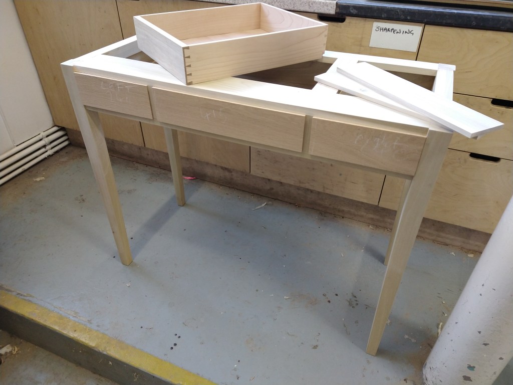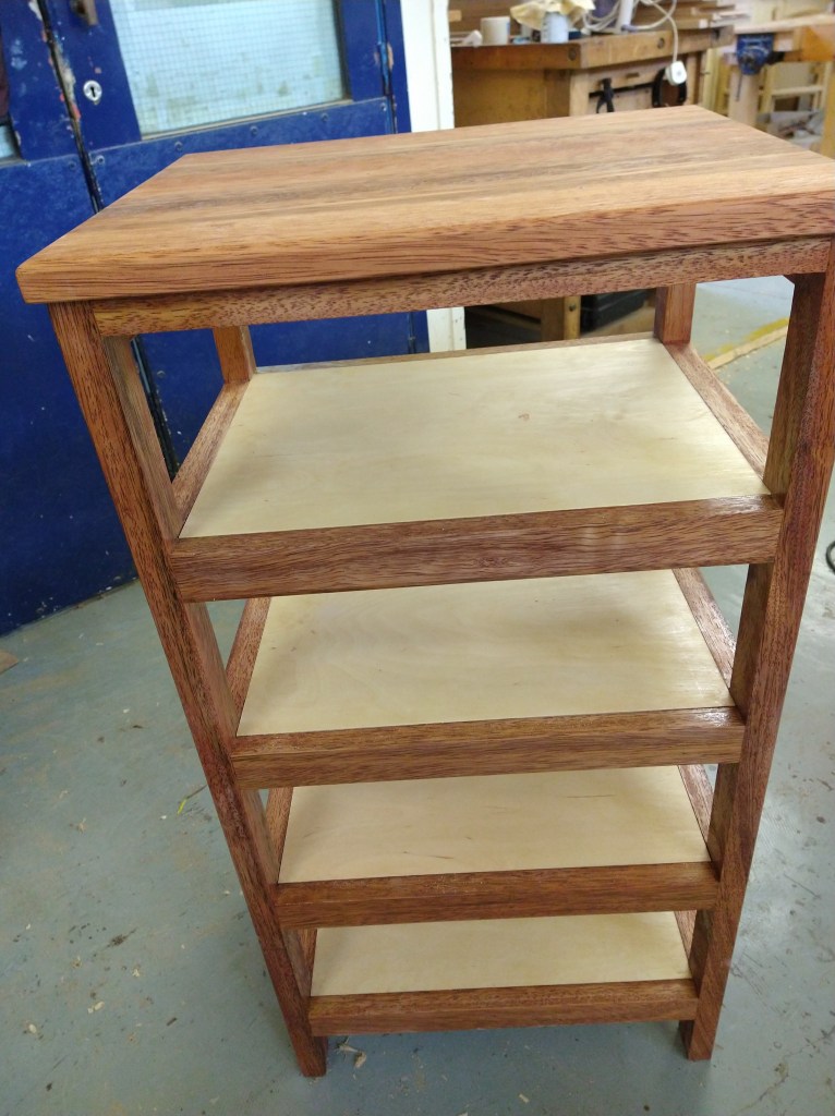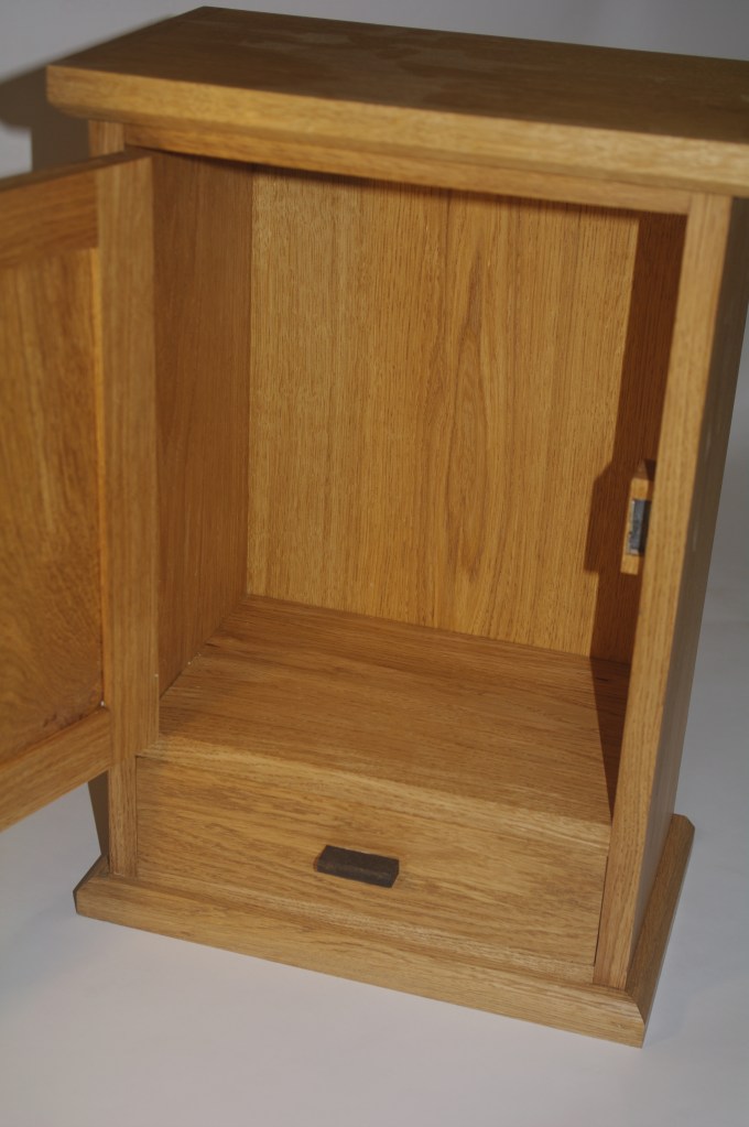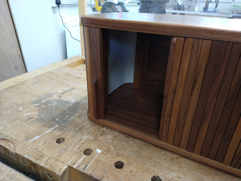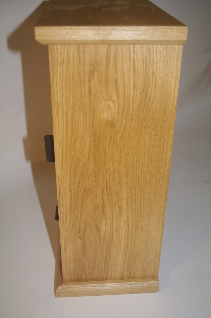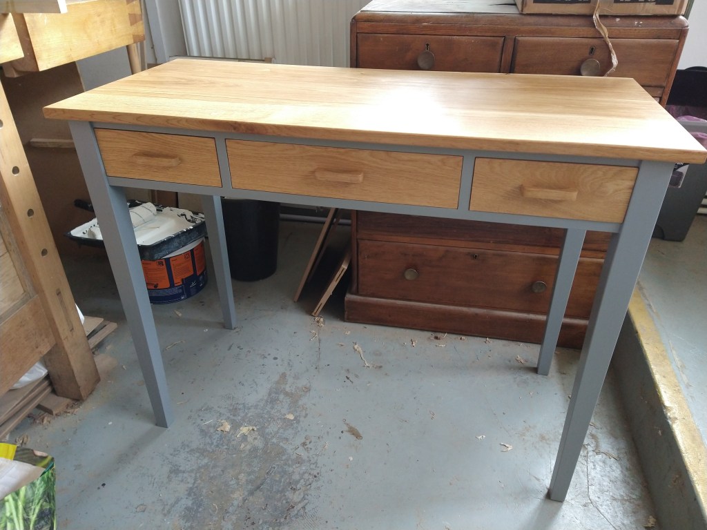 A rather strange project. We bought a magnetic knife rack – when unboxed it was incredibly plasticky and tacky – which should not have been a surprise since it cost £2.99 So the task was to break it apart and use the magnets and metal bars as a base from which to make something a little more pleasing to the eye. This was pulled together using a small piece of burr walnut as a support for the “bars” and an offcut of indian rosewood for the surround – all backed with maple. Slightly over the top maybe for a £2.99 knife rack – did we say how bored we are?This was a quick project to create a simple box to store seed packets. The wood came from an old shelf unit – we are not really sure what wood it is – it’s a very light wood with a fairly dense grain – it looks a lot more solid than it is. The top was laser engraved to personalise it. The brass hinges should ideally be complemented with a brass catch but we can’t get our hands on one at the moment so a rather rough looking chrome catch will have to do for now. The box is finished in 2 coats of boiled linseed oil and 2 coats of wax.This small cabinet was one of the prototypes for the “second project” project. After completing the introductory box building course, many people are keen to continue but don’t want to jump straight to a fairly large piece of furniture. We designed this simple one drawer, one door cabinet as a natural step up from the box building course. This version is in oak with bog oak handles – but it can also be made in ash with walnut handles. Also, not everyone has room for a new piece of furniture; the door can be fitted with a blackboard or a mirror to make it useful around the house.Very much work in progress here…. A “proptotype” desk for homeworking. One of the things we have found in our house is that we don’t have the space in the bedrooms for a full sized desk so we have been using all sorts of awkward surfaces to work on. So we decided to build a small desk with drawers that could maybe double as a dressing table or side table post-lockdown. This desk is only a little over 1m long and pretty narrow but easily big enough for a laptop and work papers. This is made primarily from Tulip wood /Poplar as it is pretty cheap with just the drawer fronts in Oak. The Poplar has a very variable colour pattern ranging from quite nice light colours to a dirty murky green – so all of the exposed Poplar will be painted. (lots of smart painted kitchens have Poplar framework) We are not sure what colour yet – it needs to match the finished oak – however the undercoat primer itself is currently a strong favourite. We are still planning the Wharfedale Workshop week long summer school project – and a desk like this may well feature. Watch this spaceWell, here is the finished prototype. We added some simple handles out of an oak off-cut – we think they do seem to match the general style of the desk. In the end we did decide that the Rustins Primer/Undercoat shade was rather nice and we had some Dulux Eggshell mixed in the identical colour by the excellent people at Mortons. The oak was then given three coats of OSMO satin wax oil. . So – the final conclusion; in general we are quite happy but it does feel a little larger than the dimensions (1050mm x 480mm) suggested in planning. It was intended to be a “work at home” desk that could then double up as a narrow hall table or dressing table, especially in a smaller home. We are now planning to re-create this, a little smaller, and probably with just two drawers; this time we will make it completely out of Elm which we’ve just bought from Duffields in Ripon. (The only drawback of making a life-size prototype is that we’we’re now left with this on our hands…..)A very quick project for a friend – a simple hi fi stand made out of reclaimed mango wood with 18mm plywood shelf inserts. Pretty solid but not really for the audiophile …. if you are, you should look at https://www.solid-sounds.co.uk This is run by a former student of Chris Tribe who makes amazing bespoke high end hi fi accessories. Take a look at the Linn turntable plinths which are built by Chris himself in the Wharfedale Workshop out of some incredible tropical and European hardwoods An extremely magnificent bread box made from walnut with tambour doors. Made on the Wednesday afternoon project class by a highly skilled woodworker, name of Phil.