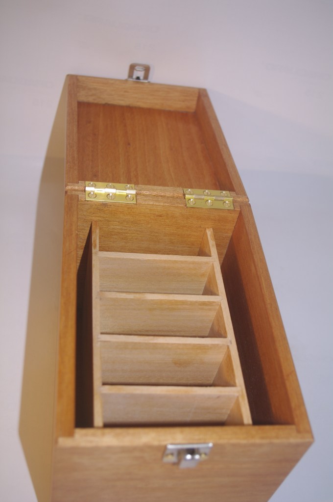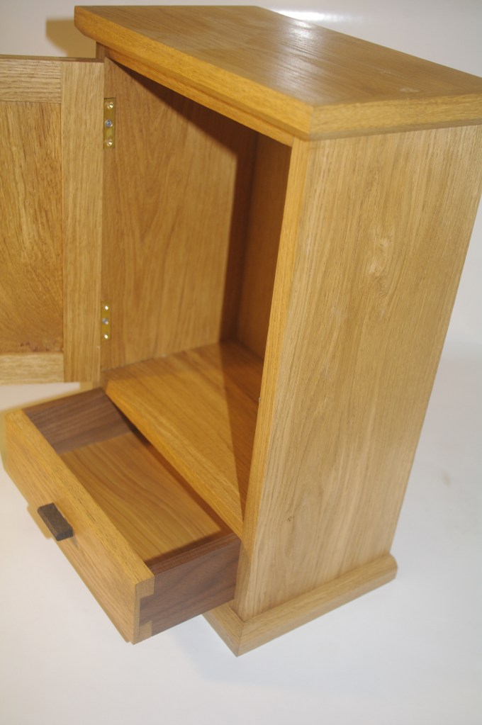This “treasure chest” was made by a pupil – out of Douglas Fir with a walnut piston fit upper tray and a lower section with walnut supports for the upper shelf. We really like the contrasting dovetails which look great with this wood. The internal tray is still to be finished but we think the pirate-style corners, catch and handles really work despite the fact that the rest of us in the workshop thought that it would look a bit odd! Sadly it is going to be used to contain art materials rather than pieces of eight….. Its maker is a very talented artist.