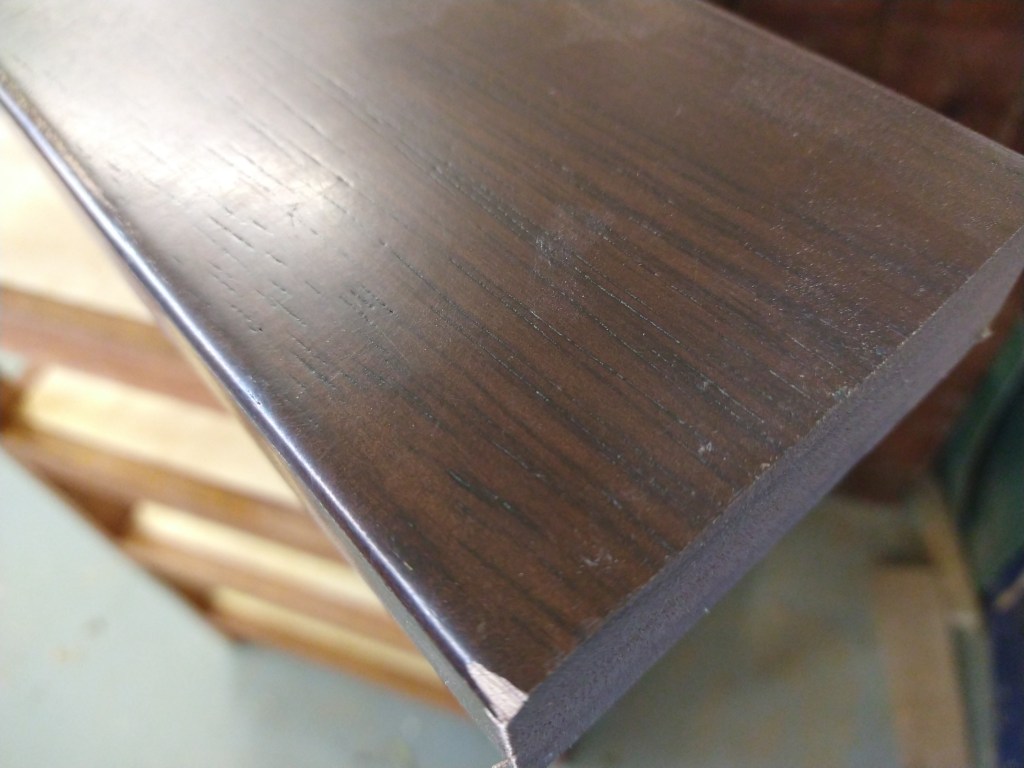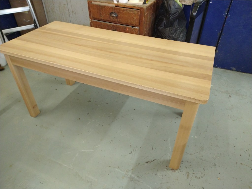Made from solid white beech it has a rounded front top and rounded front legs with a contrasting squared back as it fits up against a wall. The top is made of 7 separate planks of beech 30mm thick joined together and the legs are 75mm square; as such this is a very solid desk! It was made from 2 x 3 inch slabs or waney edge white beech from Duffields Timber.