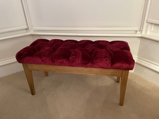 This oak stool/bench was made by a student on the Monday projects class. Their first build following the introductory course, the top was upholstered by Waltons in Ilkley to match other furniture in the room.