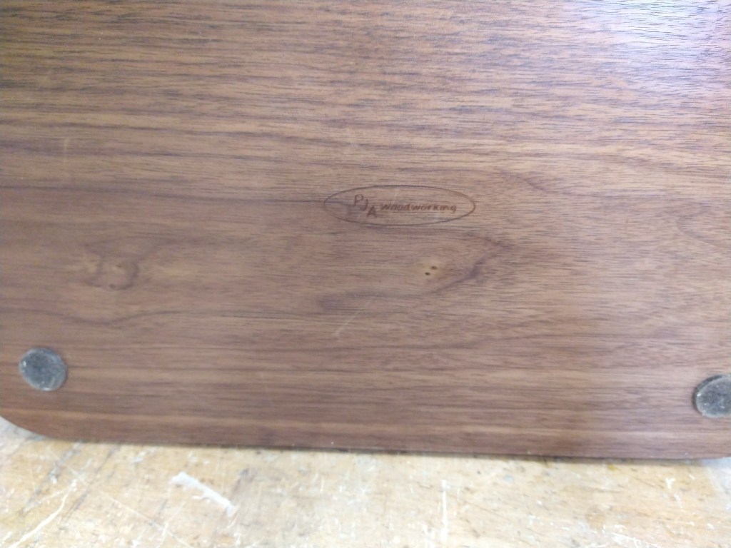The underside of the top contains a routed out pocket for a wireless phone charger which is completely invisible from the top. A double monitor stand fits directly into the top and a shelf holds a PC tower unit in between the left hand legs. It has been finished with 3 coats of OSMO 3032 and looks absolutely fantastic. Hats off to its maker, Jason.